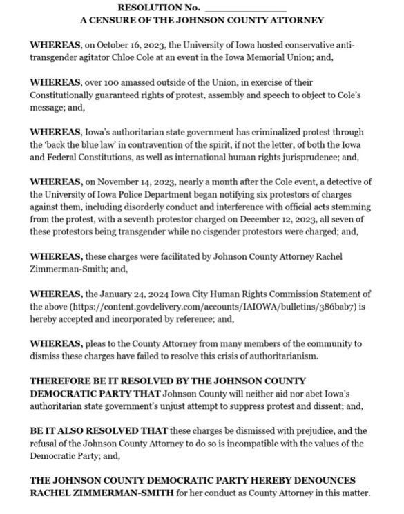 “Johnson County Central Committee member Jon Green is offering a Resolution to Censure the Johnson County Attorney (see attached). This is my response.