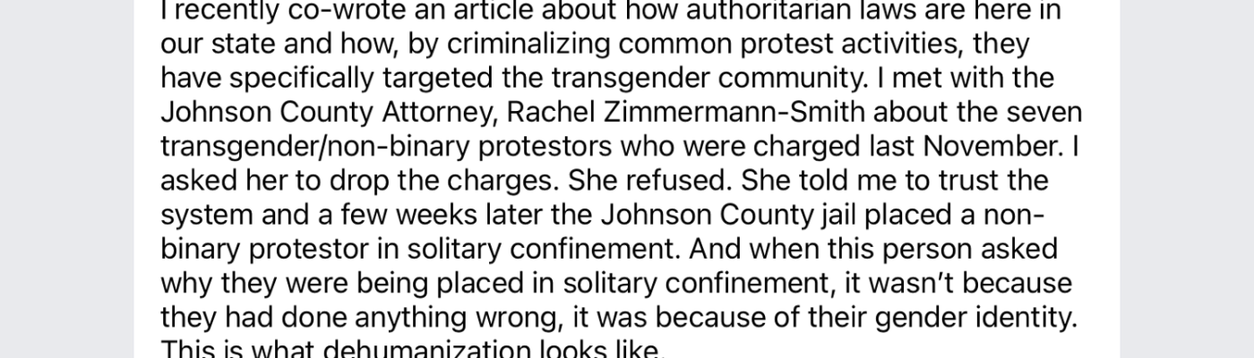I recently co-wrote an article about how authoritarian laws are here in our state and how, by criminalizing common protest activities, they have specifically targeted the transgender community. I met with the Johnson County Attorney, Rachel Zimmermann-Smith about the seven transgender/non-binary protestors who were charged last November. I asked her to drop the charges. She refused. She told me to trust the system and a few weeks later the Johnson County jail placed a non-binary protestor in solitary confinement. And when this person asked why they were being placed in solitary confinement, it wasn’t because they had done anything wrong, it was because of their gender identity. This is what dehumanization looks like.