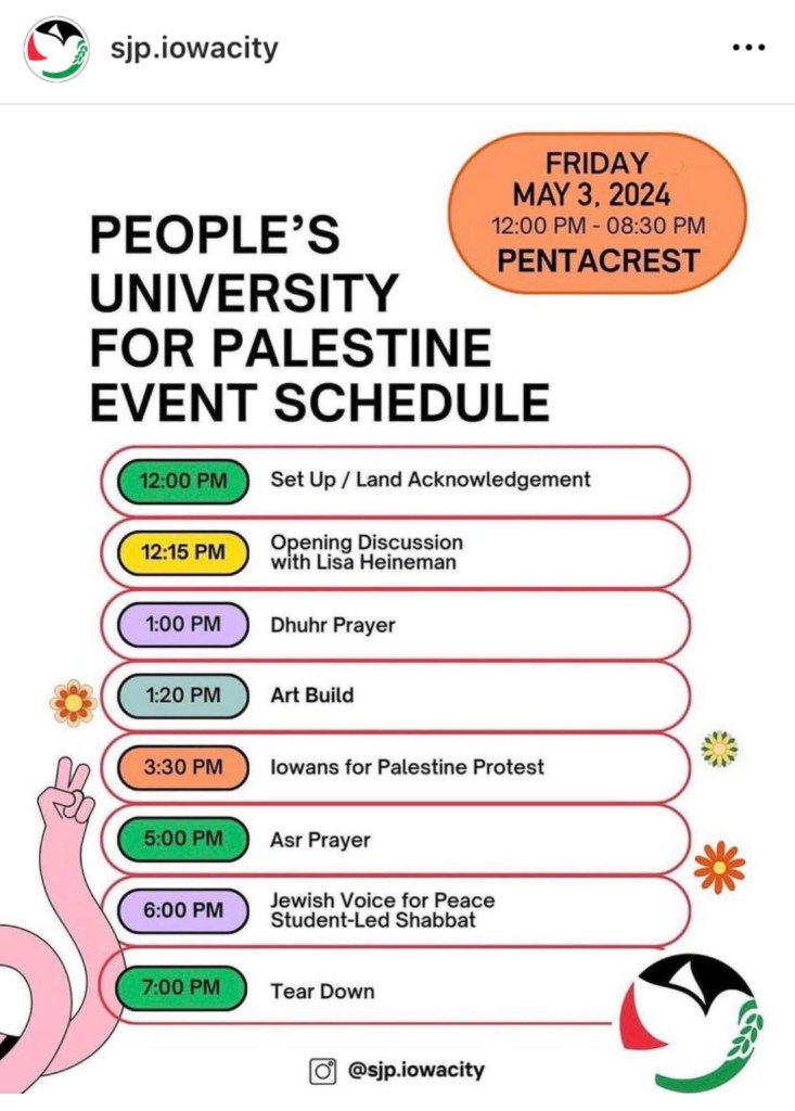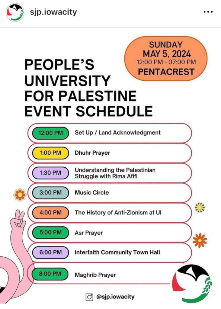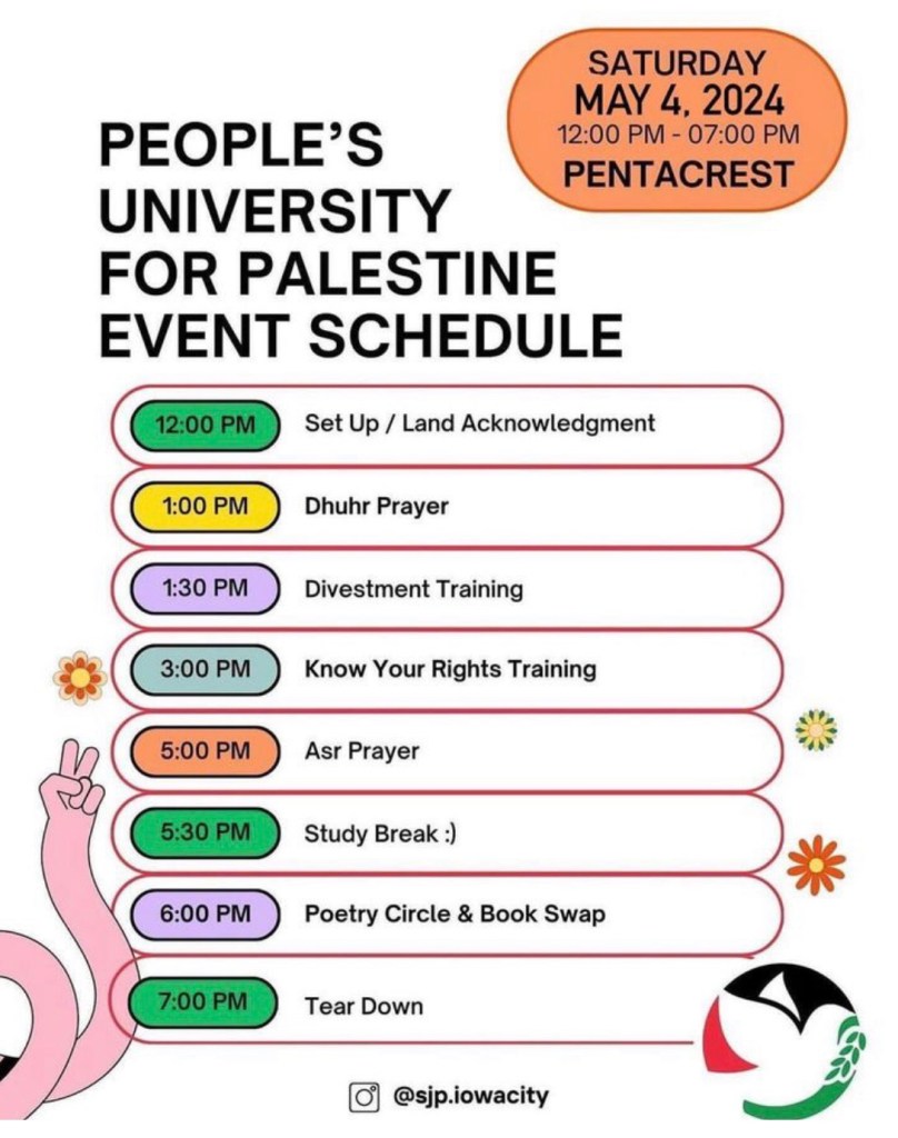The People’s University for Palestine by Students for Justice in Palestine- Iowa City is all weekend May 3-5 at The University of Iowa Pentacrest.