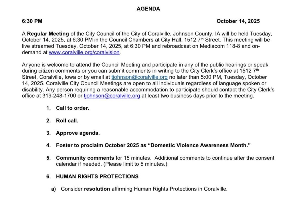 Coralville council candidate Katie Freeman was instrumental in working on this resolution in their capacity with the Johnson County Trans Advisory Council and both Freeman and also mayoral candidate Ryan Swenka have been vocally supportive of getting this done to strengthen and affirm our community.