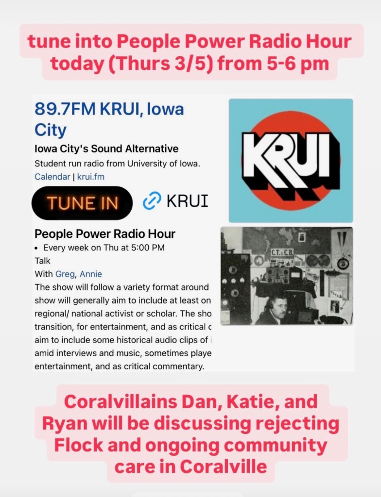 Tune into People Power Radio Hour on KRUI 89.7 FM today (Thursday, March 5) from 5-6 pm to hear a discussion about rejecting Flock and ongoing community care in Coralville.